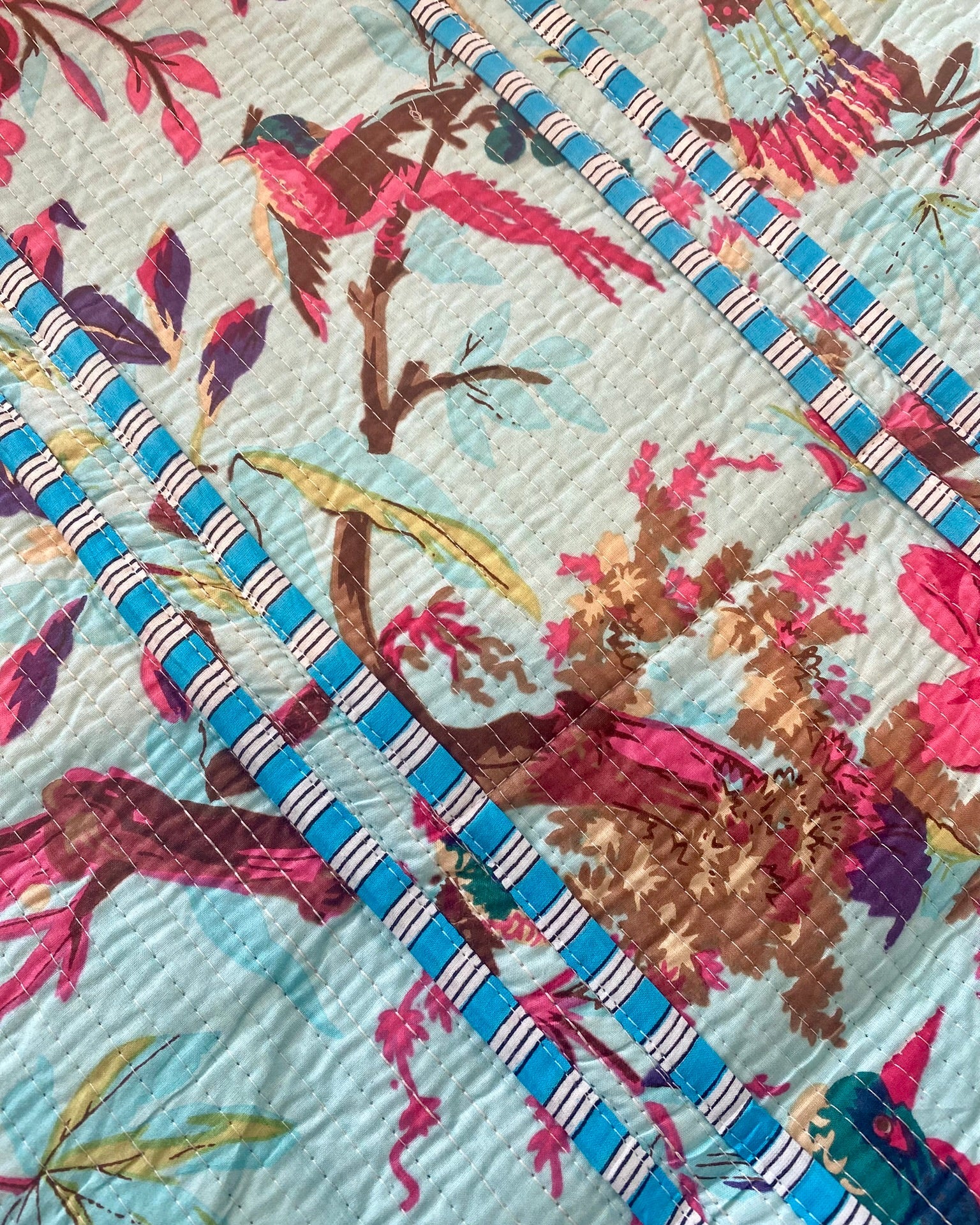 De stoffen worden stuk voor stuk op geprint door vakmensen, met een eeuwenoude techniek: hand block printing. Daarbij worden houten stempels met de hand gesneden, in natuurlijke verf gedoopt en laag voor laag op de stof gedrukt.