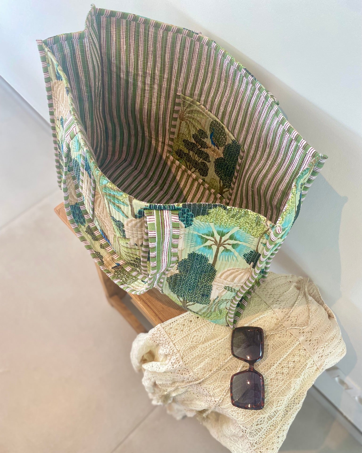 Durf op te vallen met deze stijlvolle draagtas in groen, afgewerkt met een typisch Indiase print!