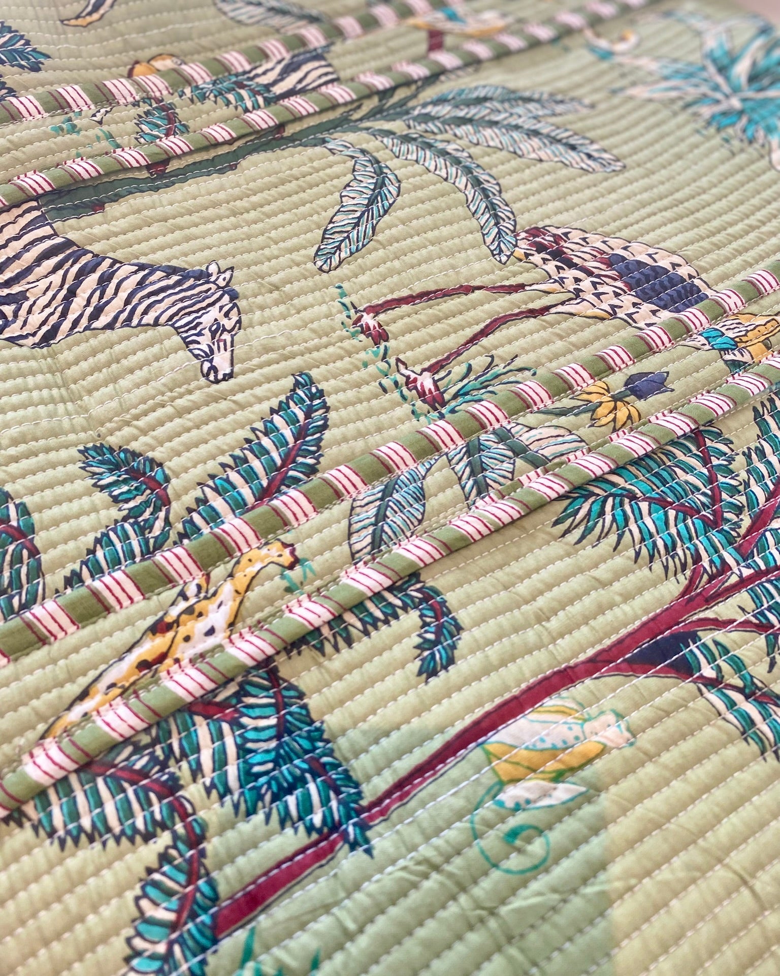 De stoffen worden stuk voor stuk op geprint door vakmensen, met een eeuwenoude techniek: hand block printing. Daarbij worden houten stempels met de hand gesneden, in natuurlijke verf gedoopt en laag voor laag op de stof gedrukt.