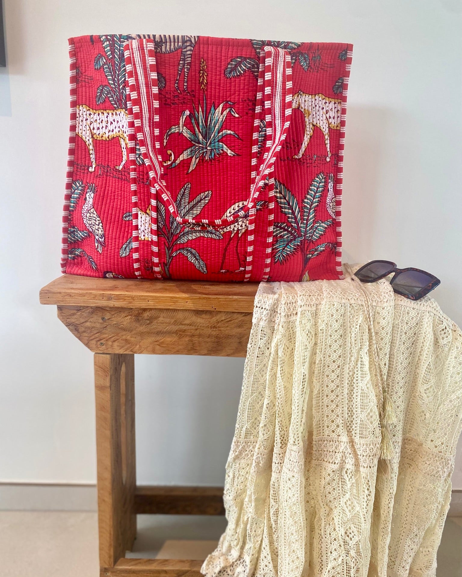 Durf op te vallen met deze stijlvolle draagtas in rood, afgewerkt met een trendy dierenprint!