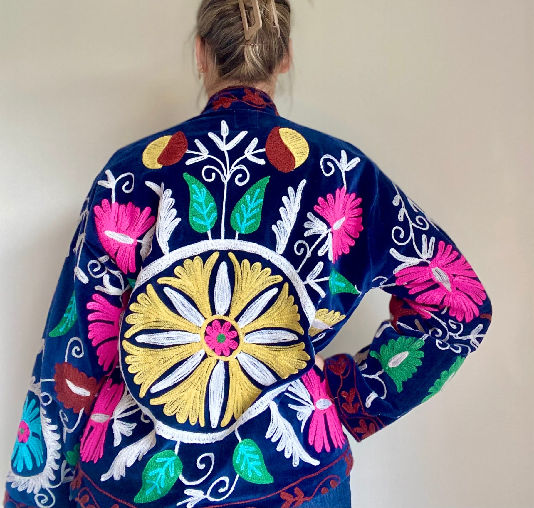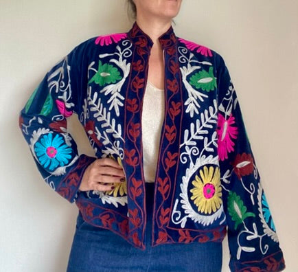 Geef je outfit karakter met dit unieke Suzani jasje, gemaakt van zacht velvet en rijkelijk versierd met handgeborduurde details.