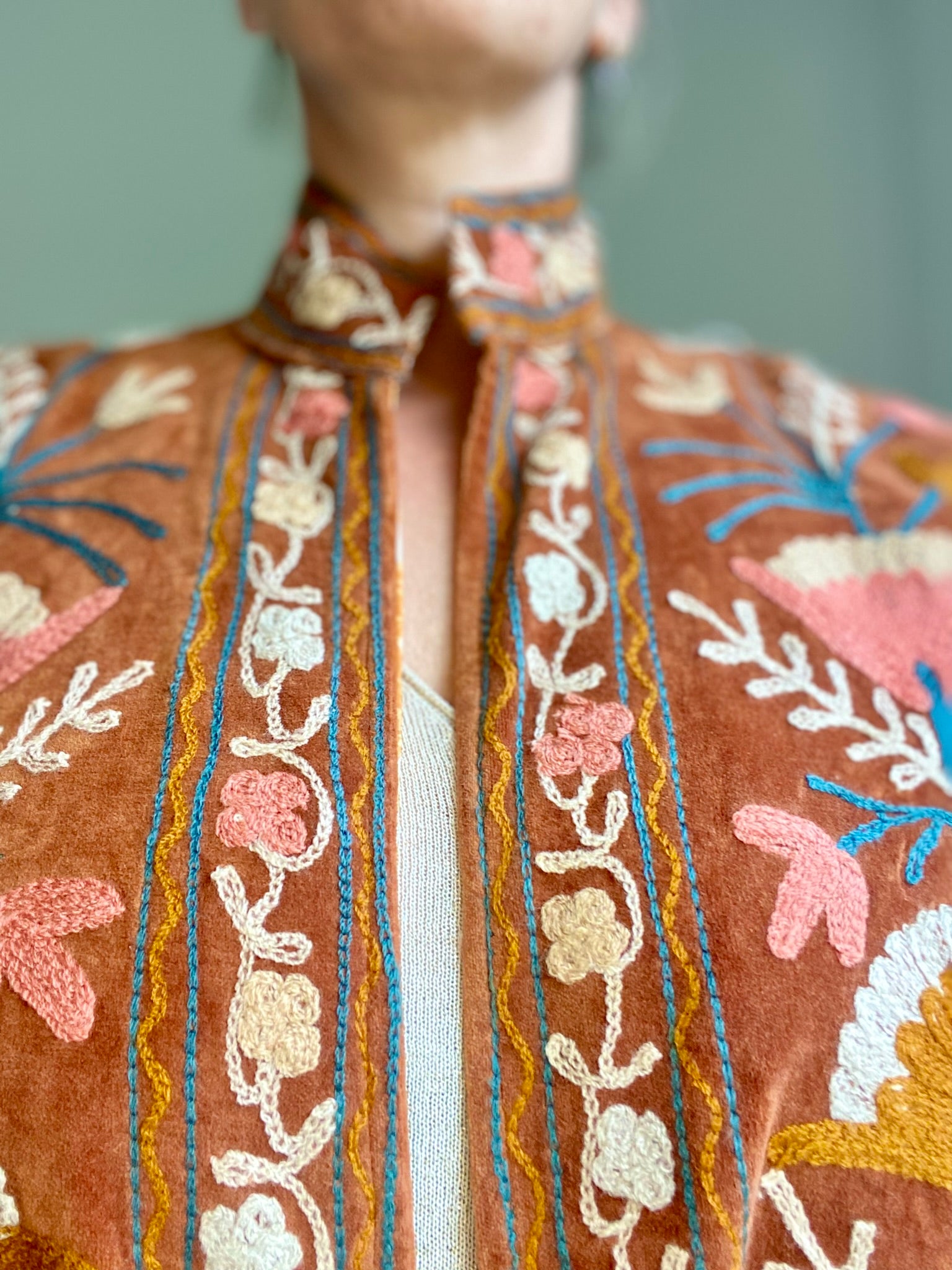 Geef je outfit karakter met dit unieke Suzani jasje, gemaakt van zacht velvet en rijkelijk versierd met handgeborduurde details.