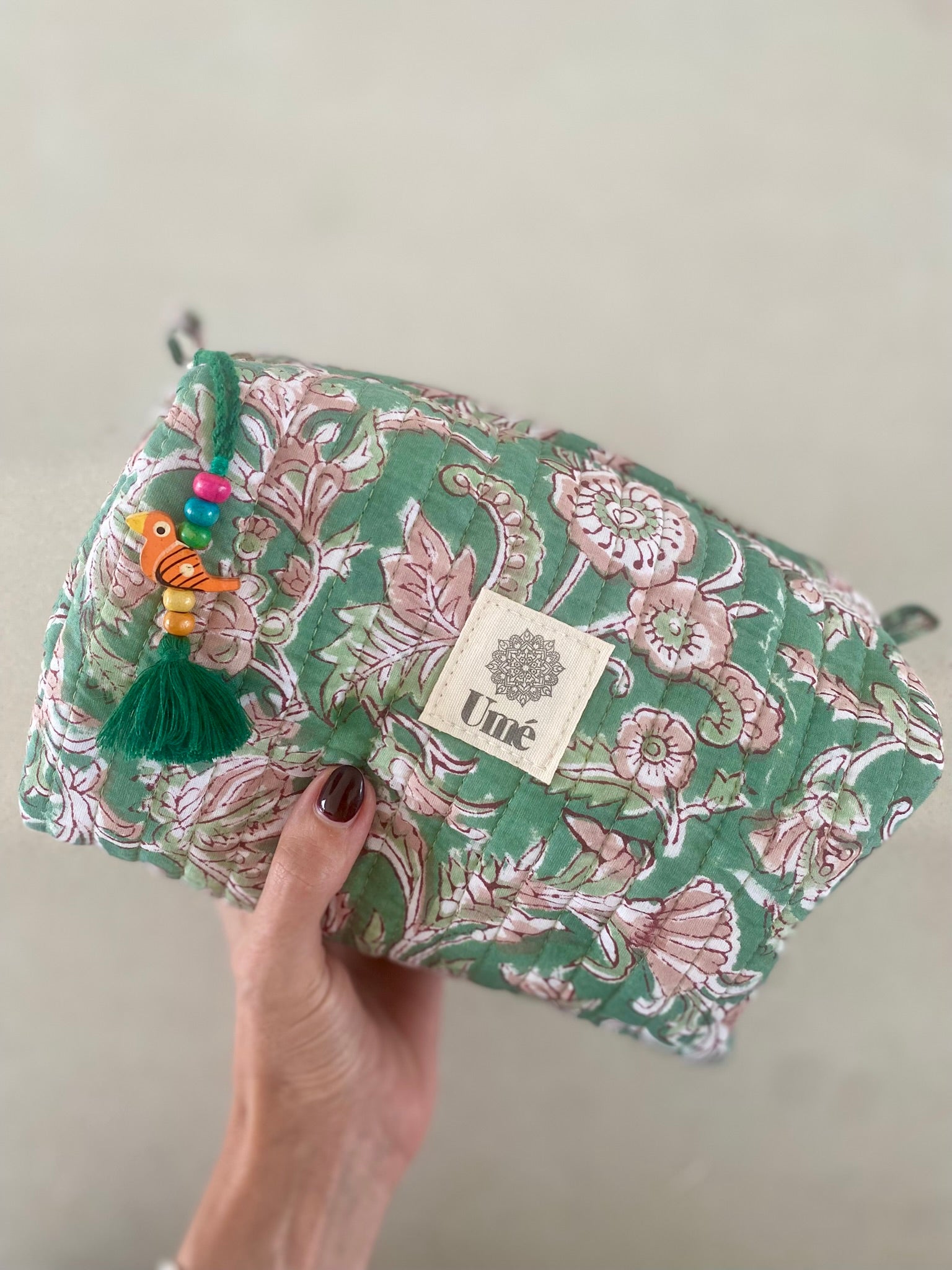 Met de hand bedrukt volgens de traditionele blockprinttechniek, is elk tasje een klein kunstwerk op zich.