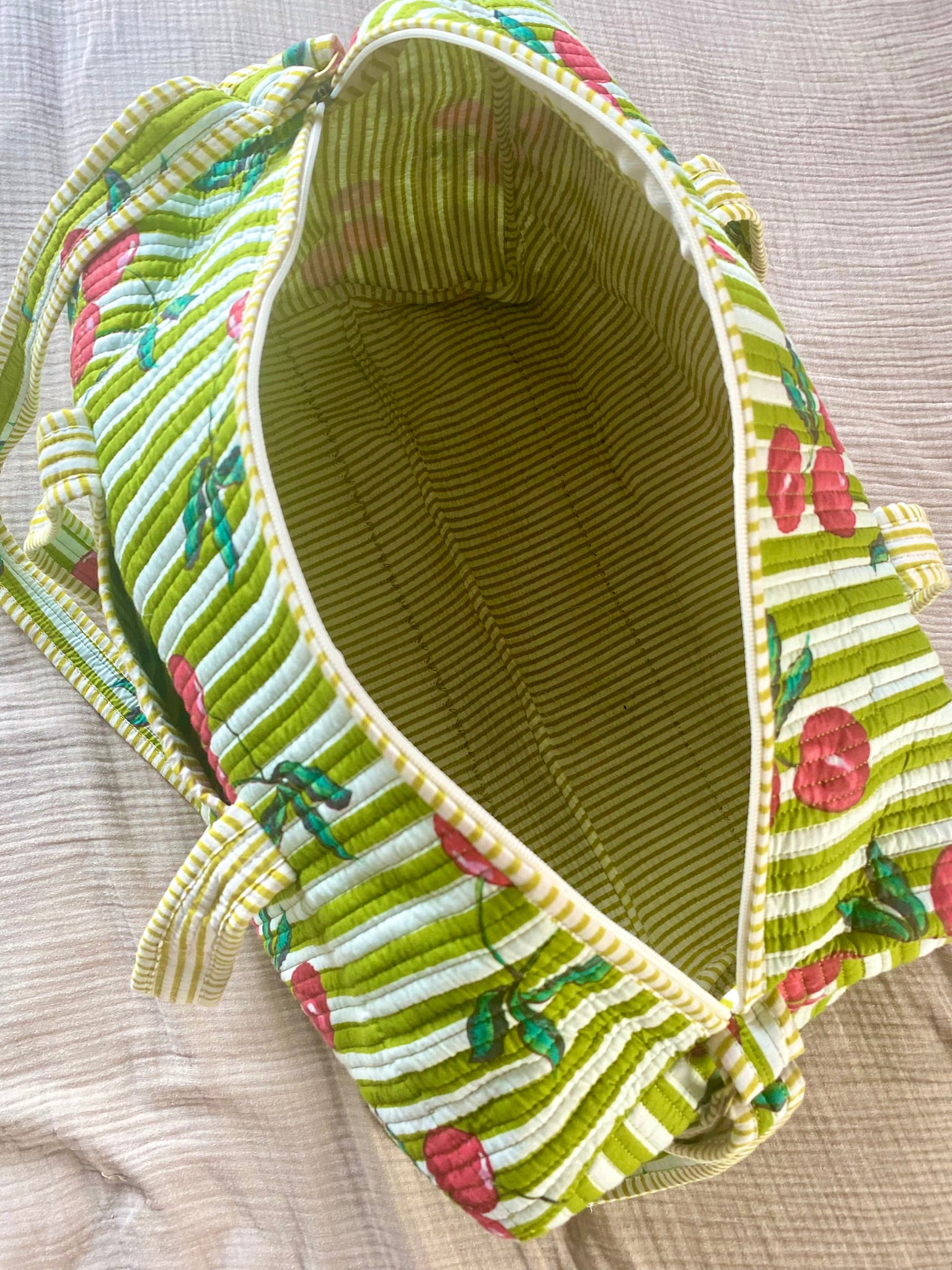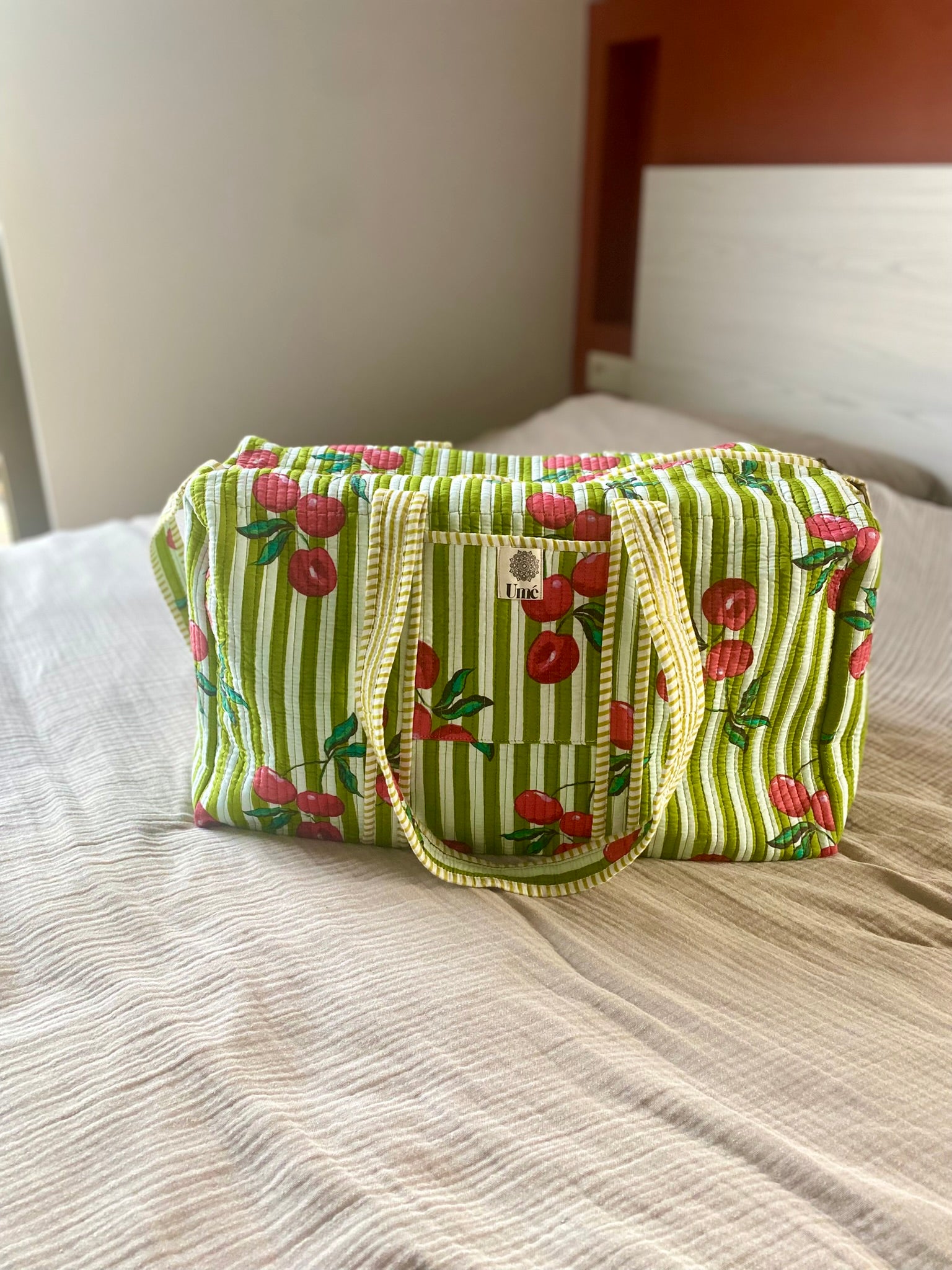 Opvallend en veelzijdig: deze stevige duffle bag is gemaakt van 100% duurzaam katoen en afgewerkt met een prachtige, traditionele Indiase print. Licht van gewicht, maar sterk genoeg om al je essentials te dragen – van een weekendje weg tot een dagje naar het strand of sportclub.